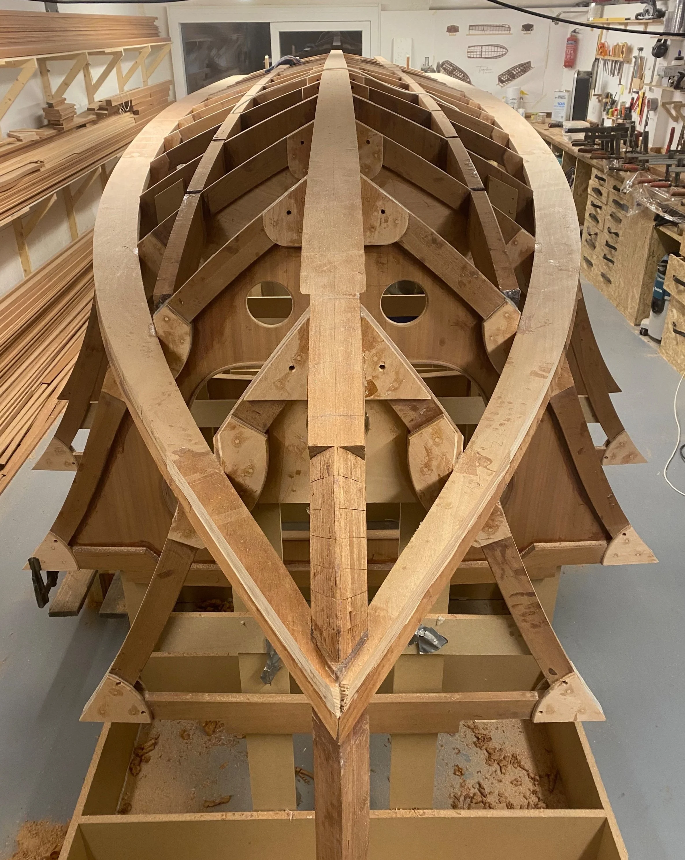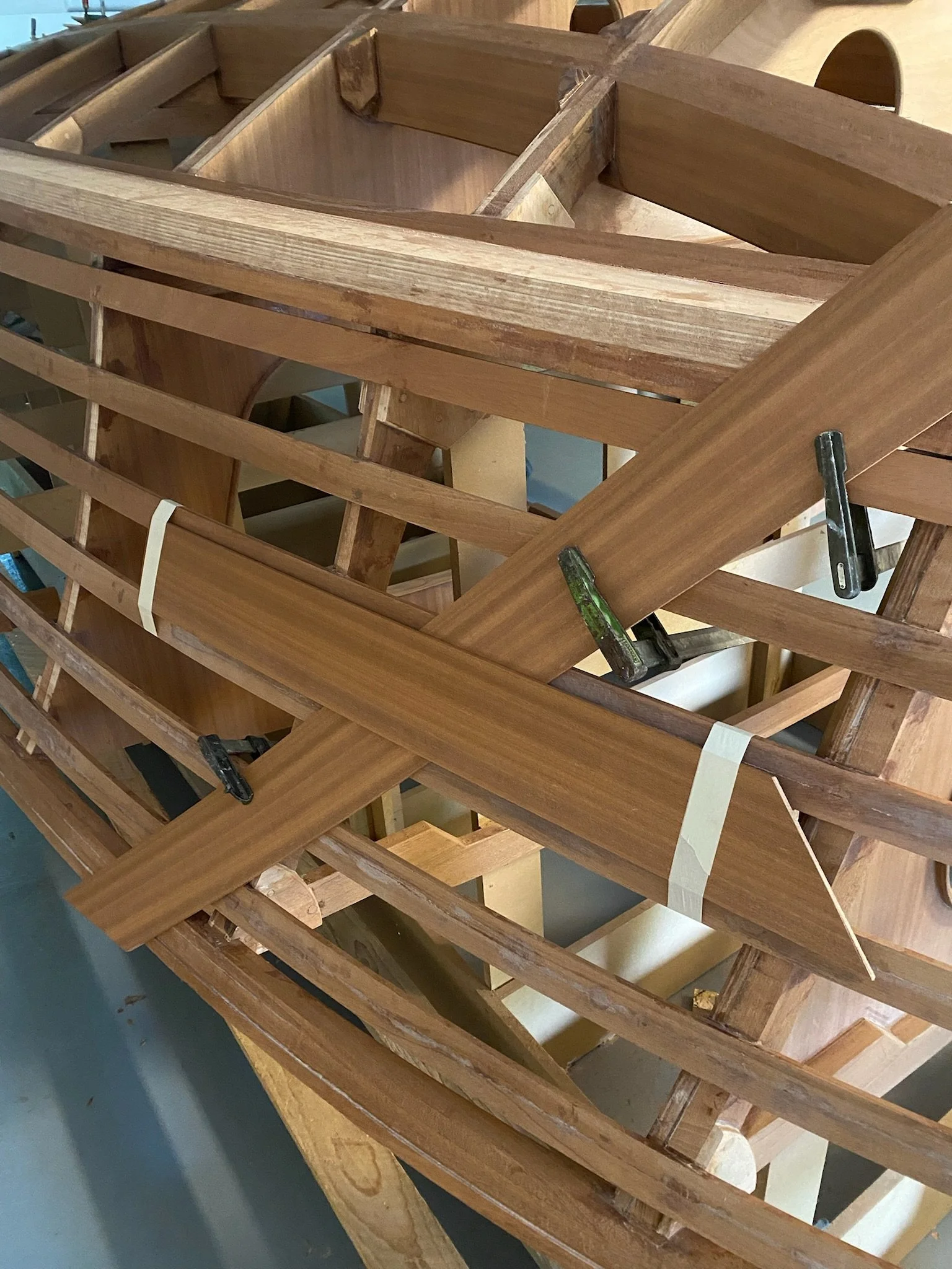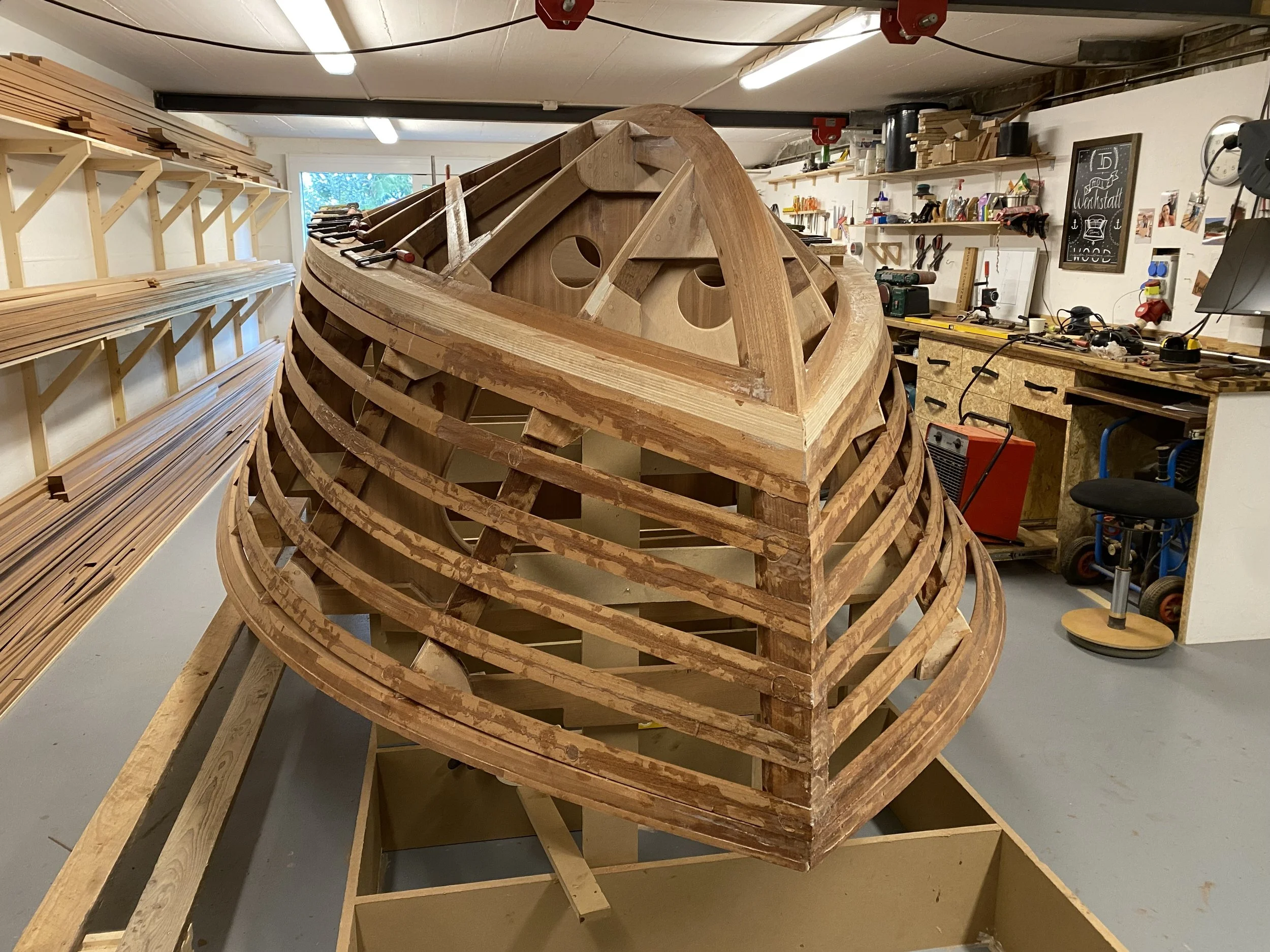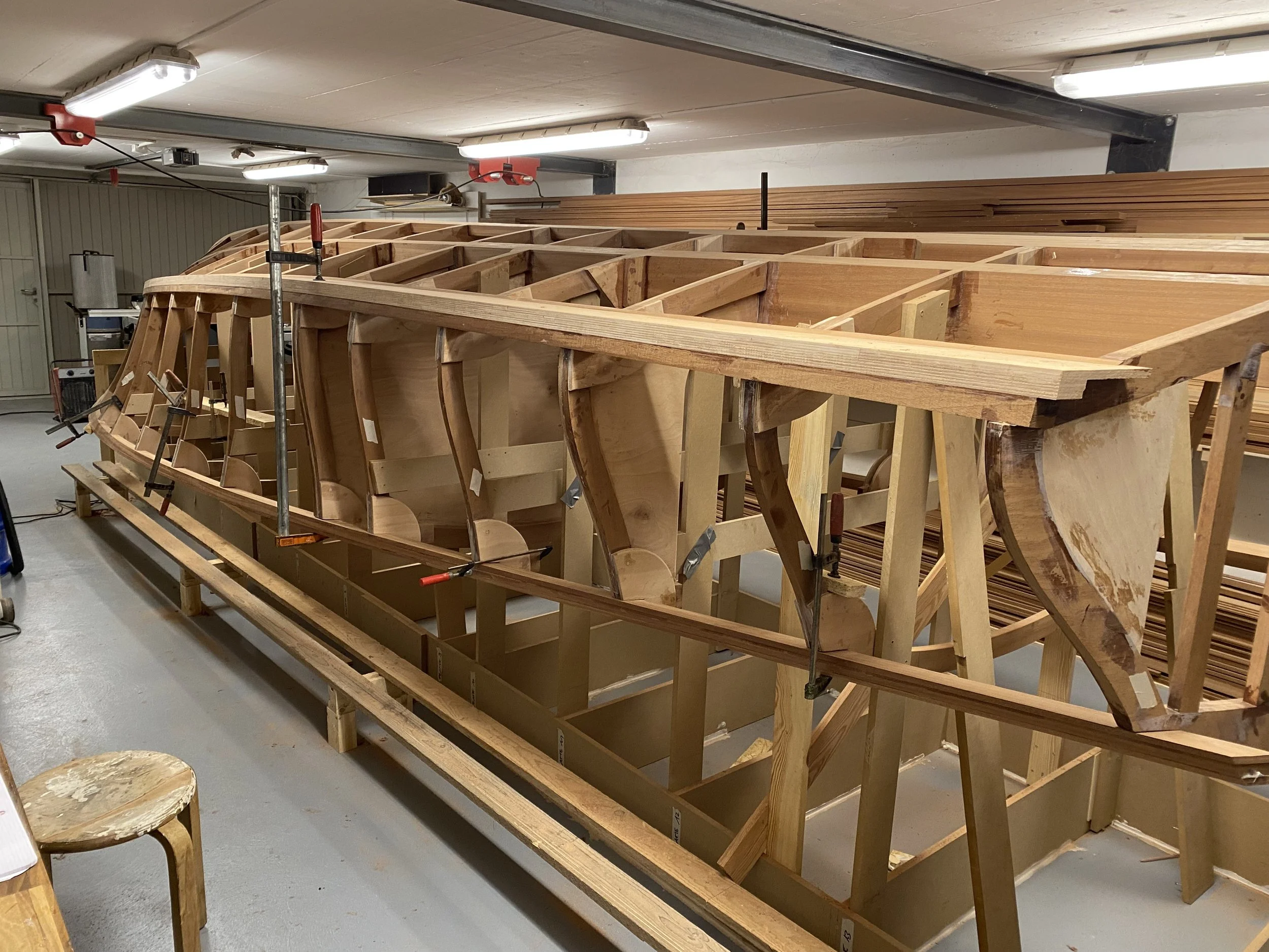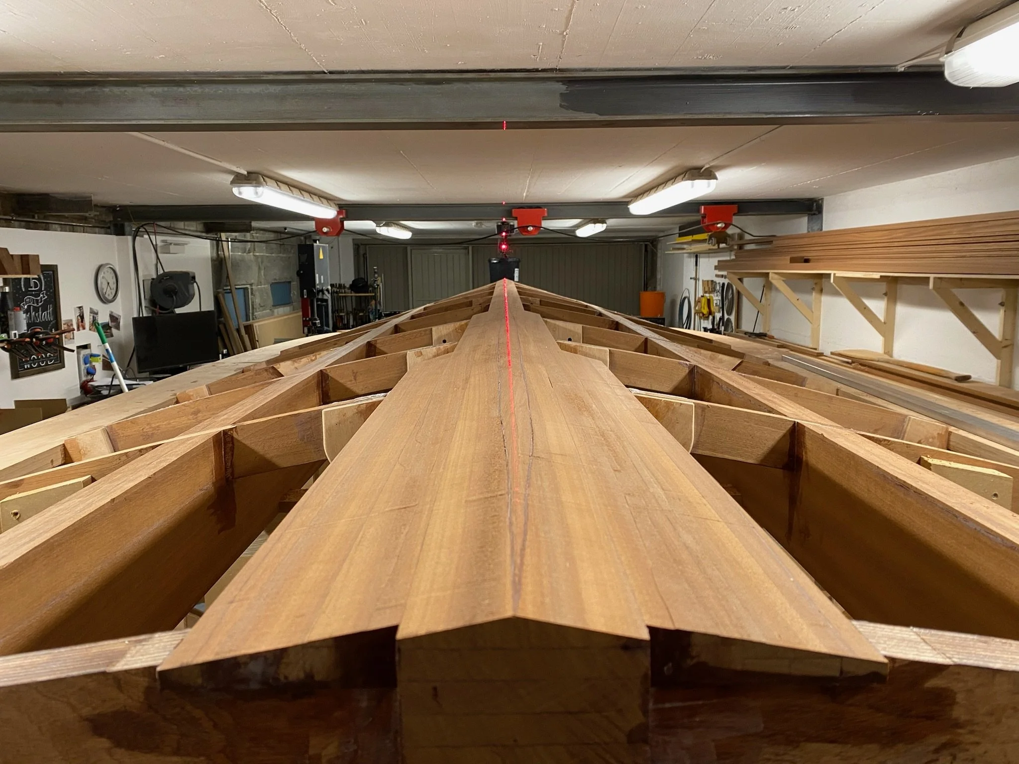 Nach dem Einpassen und Einkleben der Frames kam der Kiel dran, dann die Chines – also die seitlichen Verbindungen. Jeder Schritt brauchte Geduld, viele Anpassungen, und immer wieder kontrollieren. Bis Ende November stand das Grundgerüst der Unterseite. Drei Monate nach dem grossen Aufbau. Ein gutes Gefühl.