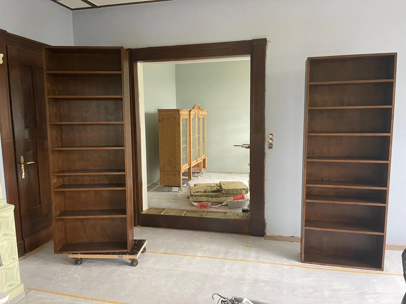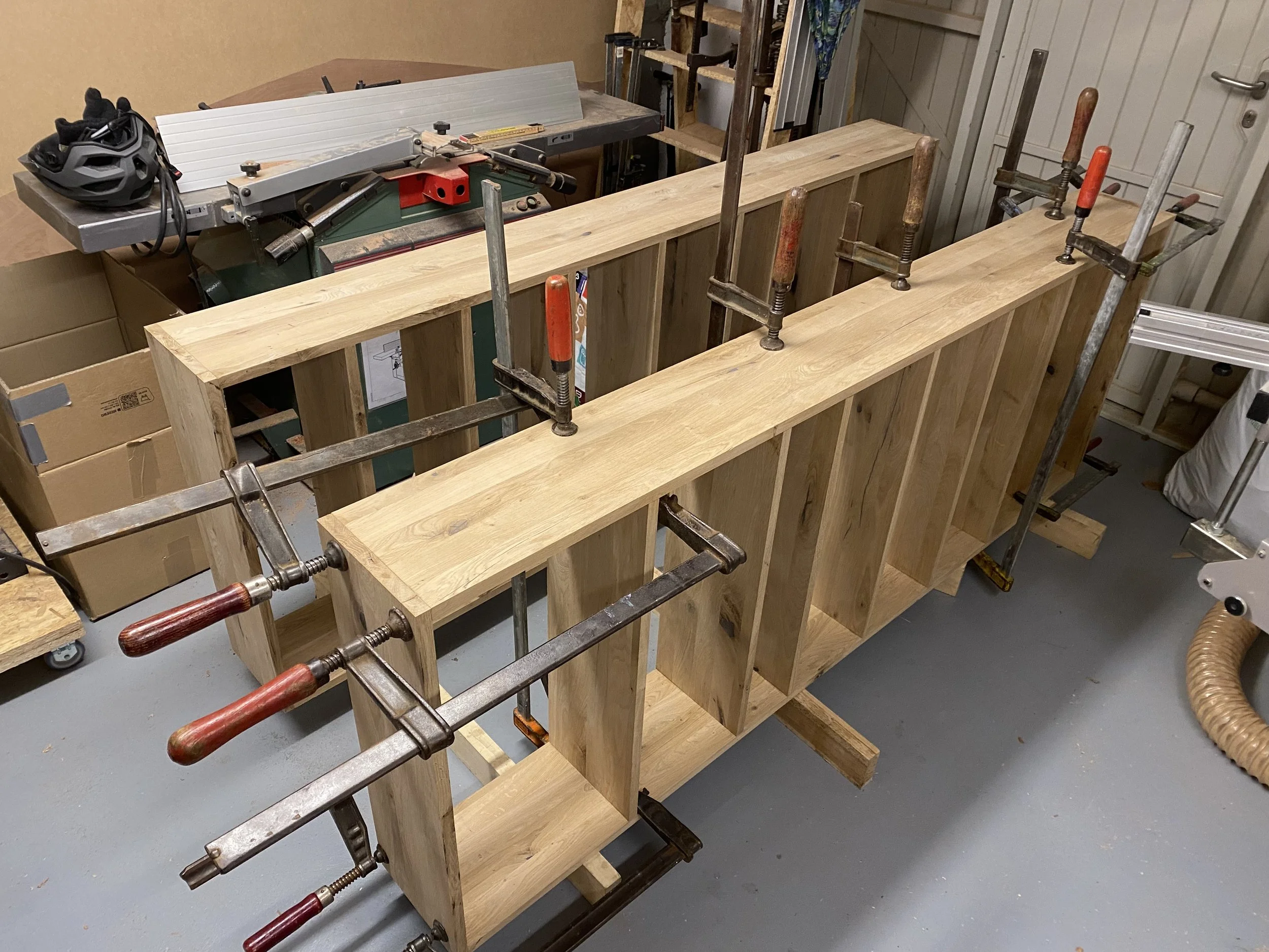 Zum anderen habe ich ein kleines Nebenprojekt gestartet: ein Regal als Raumtrenner. Totaler Tapetenwechsel – rechte Winkel, keine Stringer, kein Epoxidharz. Einfach mal wieder mit Massivholz, Holzleim und Schrauben arbeiten.