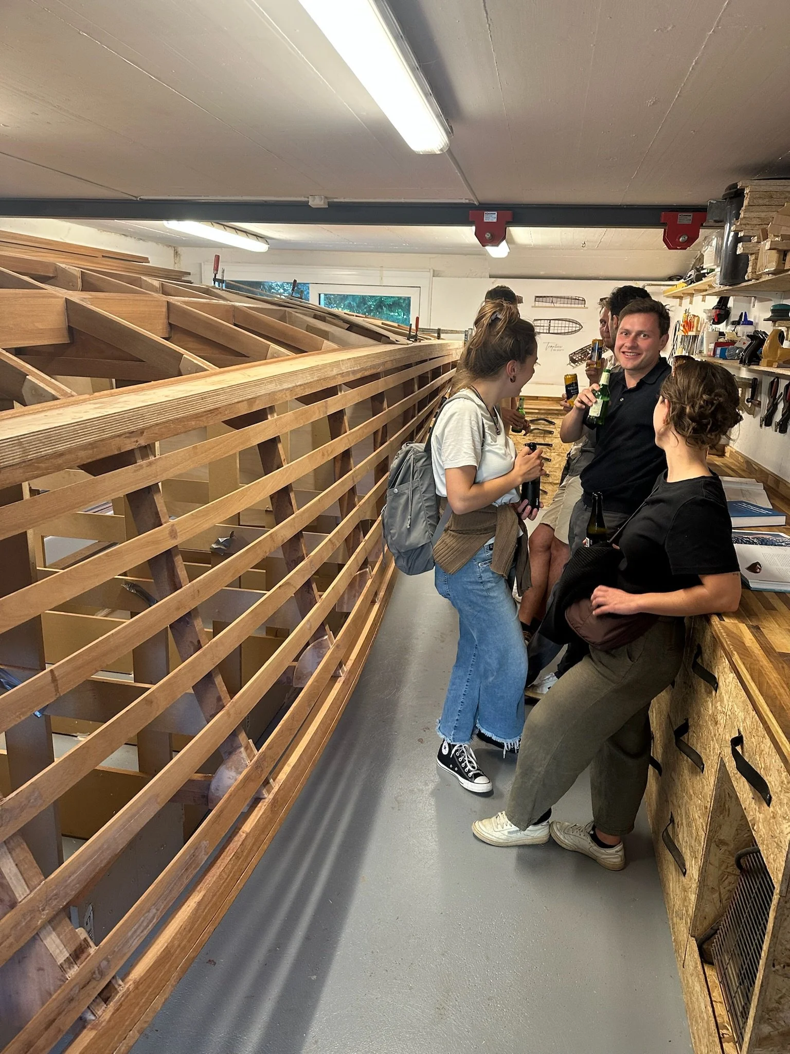 Am Anfang konnte man die Grösse des Bootes nur erahnen. Die Breite war klar, aber die Länge? Noch schwer vorstellbar. Das änderte sich schlagartig mit dem Bau der Stringer – plötzlich war da dieses lange, schlanke Ding in der Werkstatt. Und klar wurde: Das Boot braucht Platz. Viel Platz.